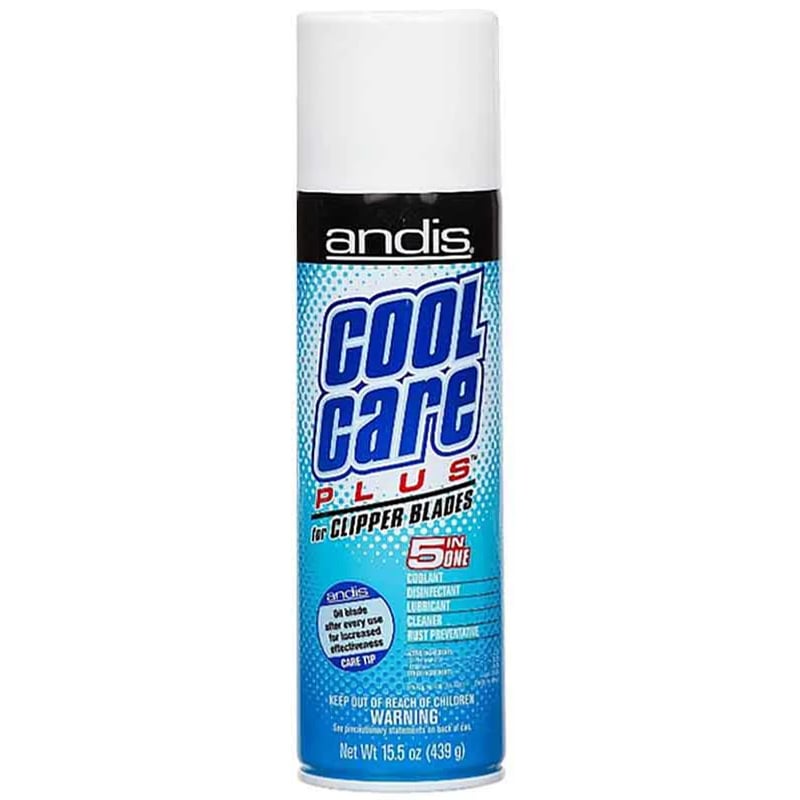 Andis Cool Care Plus 5-in-1 spray. Disinfects, lubricates, cools, cleans and protects your clipper blades. Acts as a bactericide. Leaves a light lubricating film on clipper blades that reduces friction, smooths the clipping action and extends the life of your blades.